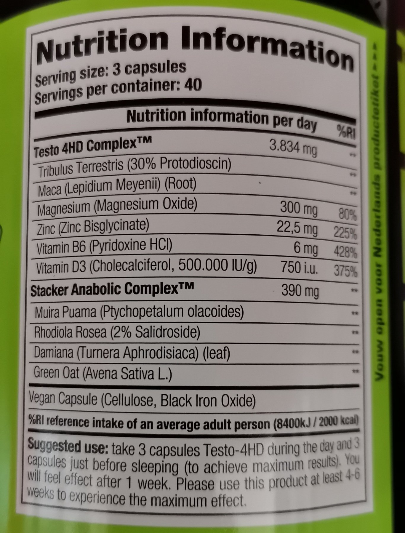 STACKER2 Testo 4HD – е најјаката анаболна формула до сега измислена. Која ќе го ослободи вашиот тестостерон до максимални граници. Вас ви треба производ кој е понапред од сите останати слични производи. Ќе ви даде експлозивна сила со ослободување на ТСТ. Дали е тоа што го баравте? Производ, кој ќе ви ја зголеми вашата мускулна маса и ќе ви ослободи немилосрдна агресија за тренирање и невиден интензитет за време на тренирањето. Ако ова е тоа што го барате, тогаш, Testo 4HD е производ за вас.